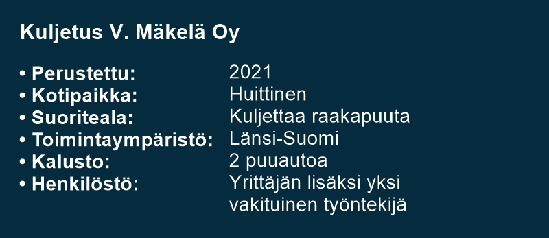 Kesäkuun alussa vuonna 2021, juuri ennen 30-vuotispäiväänsä, Ville perusti Kuljetus V. Mäkelä Oy:n keskellä koronapandemiaa. Kollegat sparrasivat liiketoimintasuunnitelmassa, ja pankki suhtautui myötämielisesti yrityksen perustamiseen.