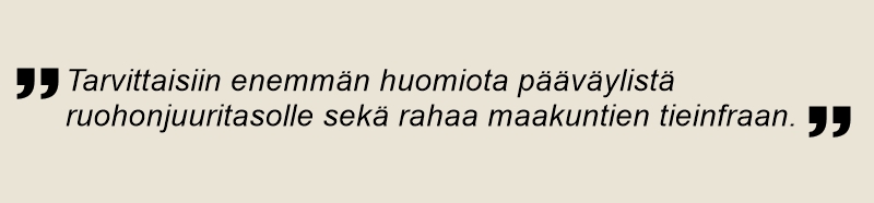 - Tarvittaisiin enemmän huomiota pääväylistä ruohonjuuritasolle sekä rahaa maakuntien tieinfraan. Metsistä ja maataloudesta saadaan raaka-aineita koko Suomen alueelle, ja tämä vaikuttaa koko maan talouteen, Ville painottaa.
