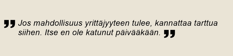 – Jos mahdollisuus yrittäjyyteen tulee, kannattaa tarttua siihen. Itse en ole katunut päivääkään.