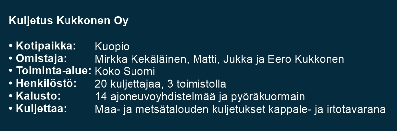 Ruska on kauneimmillaan lokakuisena torstaiaamuna, kun saavun Kuopioon. Vastassa on yrittäjäperhe kolmessa sukupolvessa. Kuljetus Kukkonen Oy:n toimitusjohtaja Mirkka Kekäläinen on kutsunut yrityksen toimipisteelle Kuopion Sorsasaloon isänsä, hallituksen puheenjohtajan Matti Kukkosen, setänsä, Kuopion Rekkahuollon toimitusjohtajan Eero Kukkosen ja isovanhempansa Martti ja Meeri Kukkosen, yrittäjät ennen sukupolvenvaihdosta. Toimipisteellä työskentelee myös muuta perhettä. Mirkan veli Santtu hoitaa yrityksen ajojärjestelyä, serkku Miika vastaa kalustosta ja Eeron poika Eetu toimii kuljettajana.