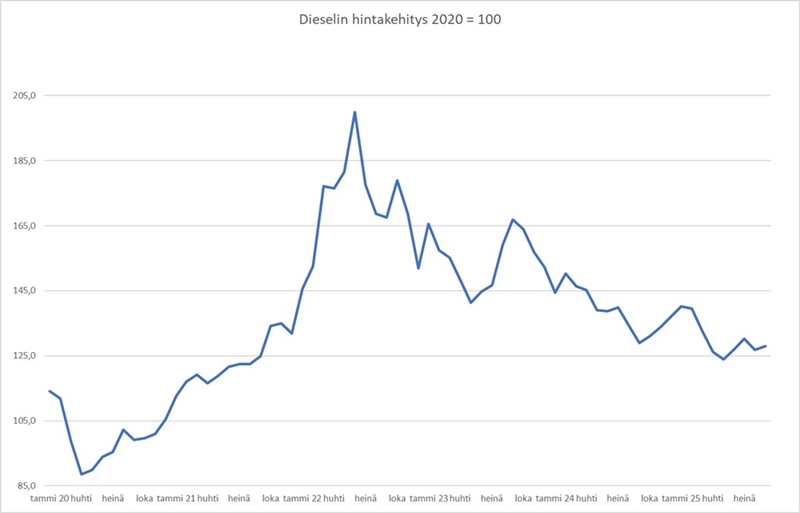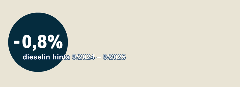 Dieselöljyn hinta on edelleen laskussa, mikä alentaa myös kuljetustoiminnan kokonaiskustannuksia. Syyskuussa 2025 diesel oli kustannusindeksin mukaan 0,8 prosenttia halvempaa kuin syyskuussa 2024. Tämän kokonaiskustannuksia laskeva vaikutus oli keskimäärin 0,2 prosenttia.