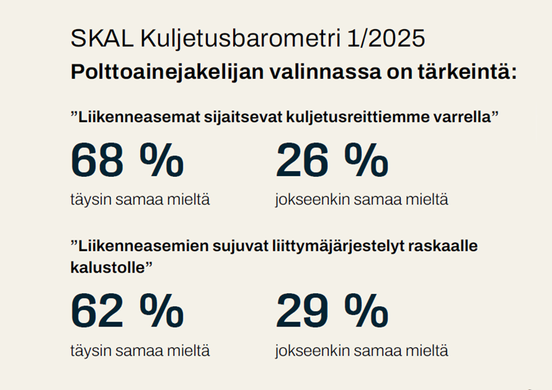 Kujala korostaa, että SKALin näkökulma on nimenomaan siinä, että tankkausasemien sijainnilla on suuri merkitys reittisuunnittelussa. Kuljetusbarometrin mukaan aseman sijainti kuljetusreittien varrella on tärkein syy polttoainejakelijan valintaan.