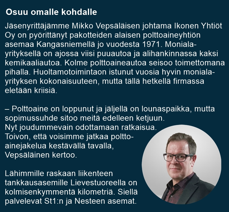 – Tilanteessa on tärkeää, että kuljetusyrittäjät ovat aktiivisia, eivätkä jää odottamaan asian korjaantumista. Vaihtoehtoiset yrityskortit kannattaa olla, jos mahdollista. Kannattaa myös selvittää ratkaisuja alueen verkoston ja kuljetusasiakkaidenkin kanssa. Viime kädessä säiliö omalle pihalle auttaa eteenpäin, Kujala vinkkaa.