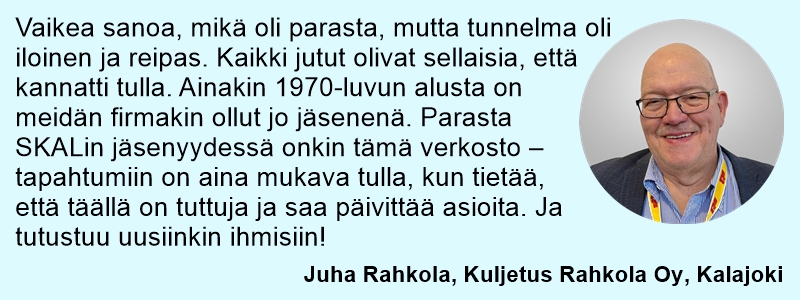 Päivän päätteeksi palkittiin Vuoden paikallisyhdistys ja Vuoden nuori SKAL Kuljetusyrittäjä sekä luovutettiin SKAL 70-vuotisjuhlasäätiön logistiikkastipendi. 1000 euron stipendi myönnetään vuosittain opiskelijalle, jonka opinnäytetyö edistää alan kestävää kehitystä, tehokkuutta ja käytännön sovellettavuutta. Sen sai aikaisemmin tänä vuonna Jyväskylän ammattikorkeakoulusta logistiikan insinööriksi valmistunut Teemu Tähtinen tunnustuksena hänen kestävän logistiikan kehitystä edistävästä ansiokkaasta opinnäytetyöstään, joka tarkastelee vihreän siirtymän vaikutuksia kuljetusalalla Pohjois-Suomessa.