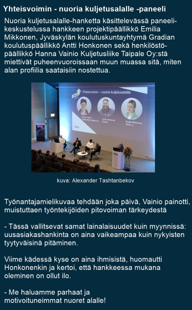 Kuljetusyrittäjä Ville Mäkelä valittiin vuoden nuoreksi kuljetusyrittäjäksi positiivisen asenteensa, halukkuutensa kehittyä ja vahvan verkostoitumisensa ansiosta. Valitsijaraadin mukaan Mäkelä edustaa nuorta kuljetusyrittäjyyttä parhaimmillaan. Hän on aktiivinen kuljetusalan puolestapuhuja, joka tekee alasta näkyvää myös sosiaalisessa mediassa.
