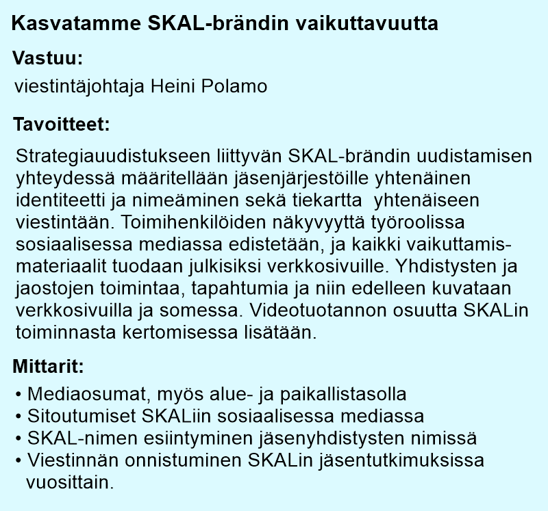 Strategiamme ensimmäinen täysi vuosi päättyy ja sitä esittelevässä sarjassamme on tultu kuudenteen ja viimeiseen strategiseen valintaan: brändiin sekä sen vahvistamiseen. SKALin tavoitteena on vahva ja valtakunnallisesti tunnistettava yhtenäinen SKAL, joka viestii toiminnastaan näkyvästi ja tavoittaa myös tulevan jäsenkunnan. Tavoitteen toteutumisen eri muotoja voi seurata jokainen niin jäsenviestinnän kanavissa kuin valtakunnan mediassakin.