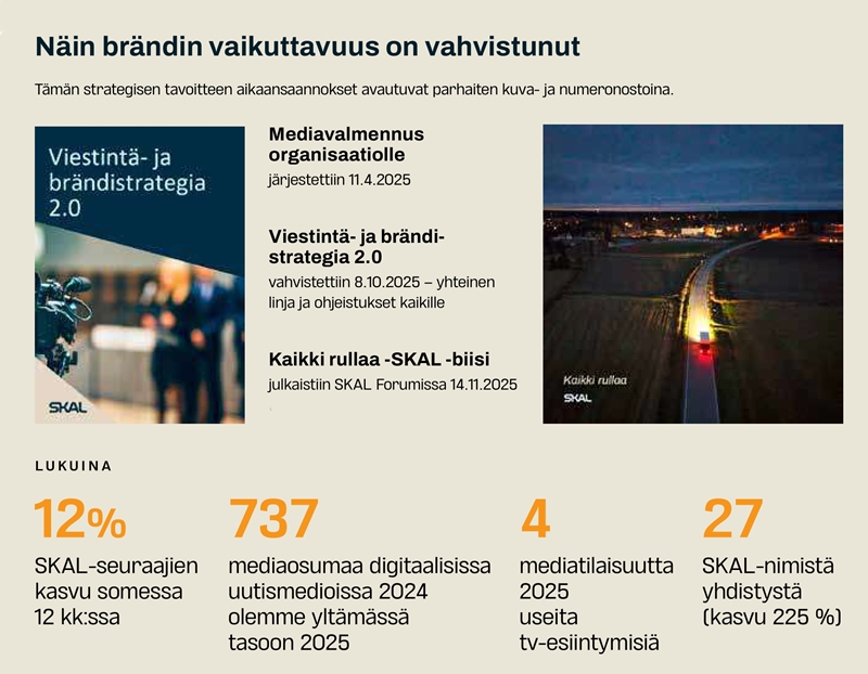 Tässä juttusarjassa kerromme SKALin uuden, vuonna 2024 käyttöön otetun strategian etenemisestä toimenpiteisiin. Tällä kertaa vuorossa on SKAL-brändin vaikuttavuuden kasvattaminen.