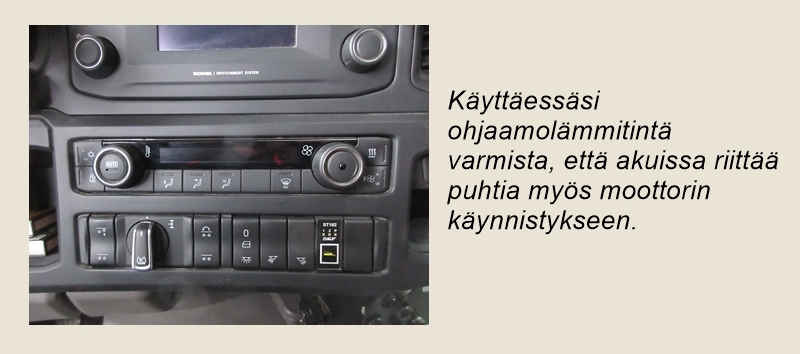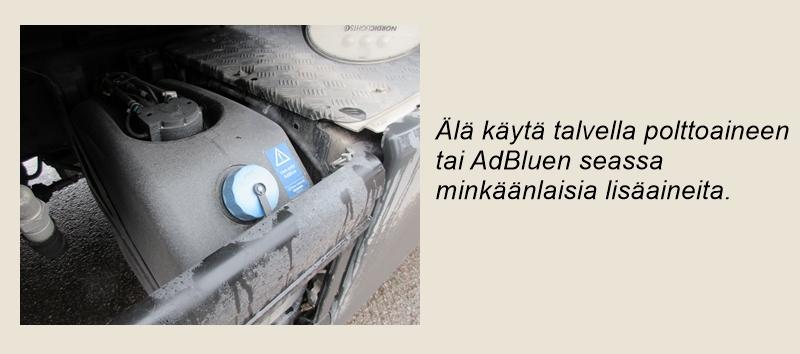 Tankkaa aina talvilaadun polttoainetta, tarvittaessa arktista laatua. Ennen ajoon lähtöä kannattaa tarkistaa ohjaamon lämmittimen toiminta. On myös tärkeää antaa lämmittimen tehdä sammutustoiminta loppuun asti ennen ajoneuvon päävirran katkaisemista. Varaa varmuuden vuoksi lämmintä vaatetta, jos joudut pulaan kovassa pakkasessa. Jäätynyttä paineilmajärjestelmää ei enää pysty lämmittämään pakokaasuletkulla niin kuin ennen vanhaan: muoviset jarruletkut ja komposiittisäiliöt sulavat nopeasti pakokaasun lämmöstä. Paras tapa päästä huolettomiin kilometreihin onkin pitää huolta ilmankuivaajasta.