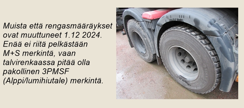 Vaikka talvea saattaa varsinkin Etelä-Suomessa joutua odottamaan pitkäänkin, kyllä se sieltä aina tulee. Laki asettaa raamit esimerkiksi renkaiden kunnolle sekä varustukselle, maalaisjärki asettaa rajat omalle toiminnalle. Ennakoiva talvihuolto sekä turvallinen ajotapa mahdollistavat vähäongelmaiset ajokilometrit kevään tuloa odotellessa.