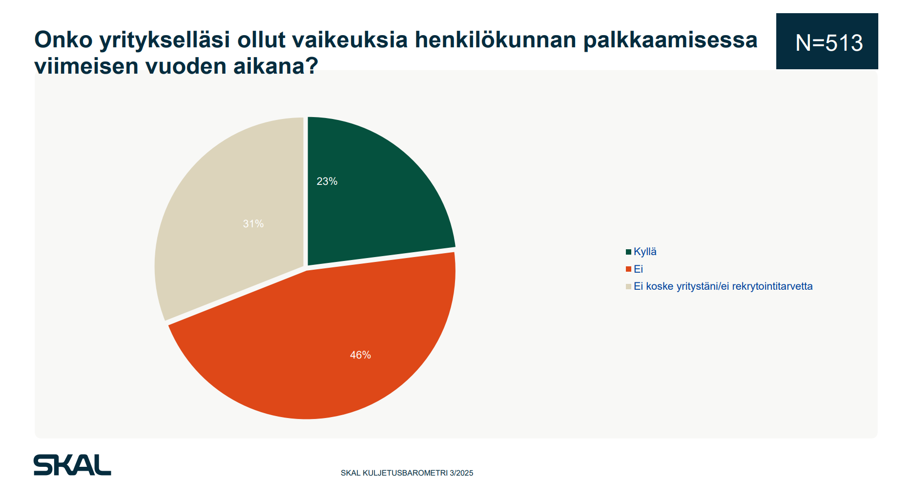 Kuva: SKAL Kuljetusbarometri 3/2025 kuljetusyritysten rekrytointivaikeuksista.