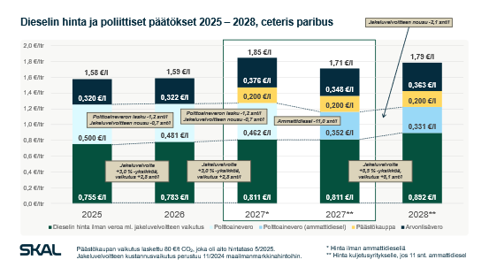 SKAL huomauttaa, että esitetystä polttoaineveron alentamisesta huolimatta dieselöljyn hinta Suomessa on nousemassa poliittisten päätösten vuoksi vuosina 2026 ja 2027. Jakeluvelvoitteen kiristyminen ja liikennepolttoaineiden päästökaupan käynnistyminen vuonna 2027 ovat nostamassa dieselin hintaa SKALin arvion mukaan 27 sentillä per litra, vaikka huomioon otetaan myös nyt ehdotettu polttoaineveron alennus. Tästä syystä on ensiarvoisen tärkeää, että hallituksen linjaamalla tavalla vuoden 2027 alusta Suomessa otetaan käyttöön ammattidiesel.