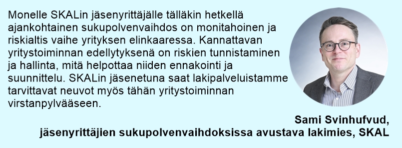 Sukupolvenvaihdos on sekä tunne- että talousasia. Hyödynnä tilitoimistoa, juristia ja yritysjärjestelyjen asiantuntijoita, jotta ratkaisu on verotehokas ja oikeudellisesti turvallinen.